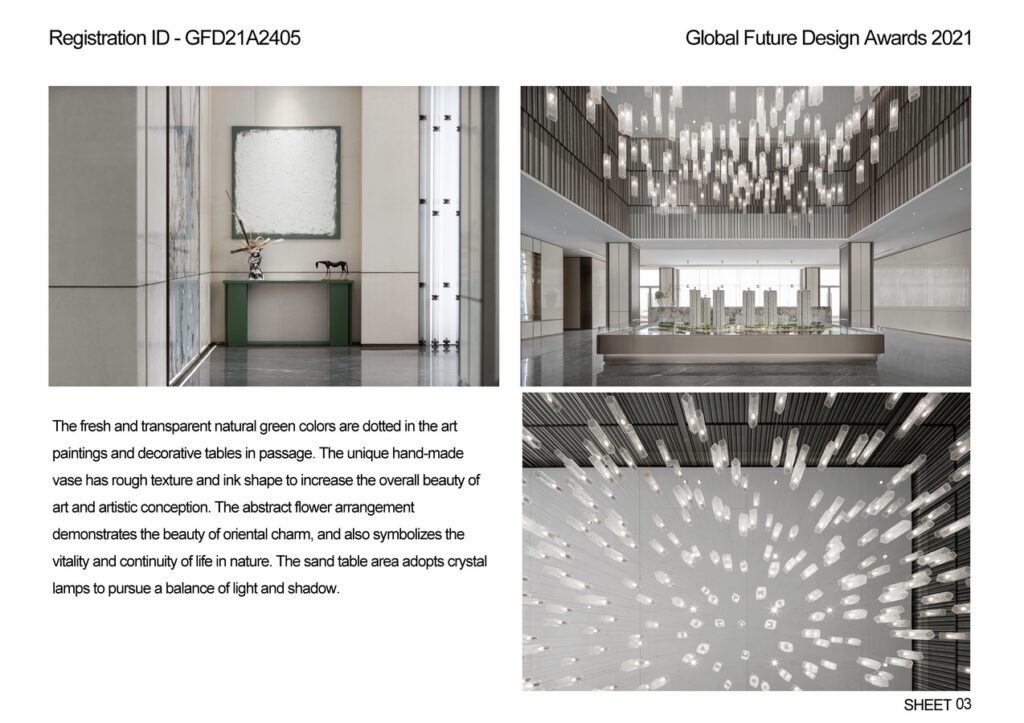 The fresh and transparent natural green colors are dotted in the art paintings and decorative tables in passage. The unique hand-made vase has rough texture and ink shape to increase the overall beauty of art and artistic conception. The abstract flower arrangement demonstrates the beauty of oriental charm, and also symbolizes the vitality and continuity of life in nature. The sand table area adopts crystal lamps to pursue a balance of light and shadow.