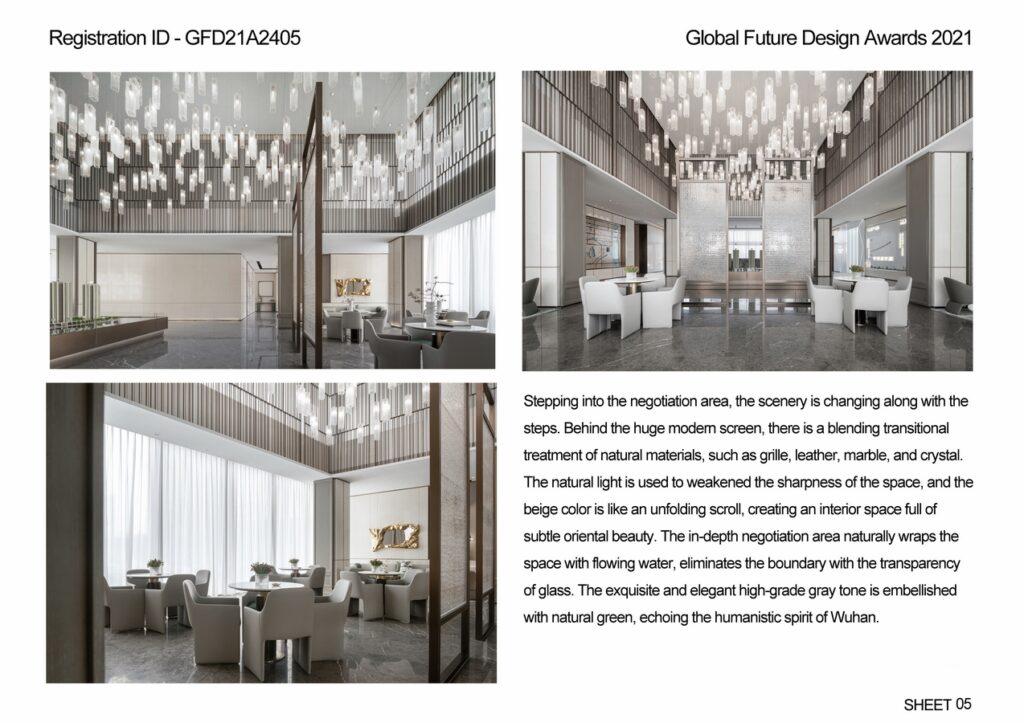 Stepping into the negotiation area, the scenery is changing along with the steps. Behind the huge modern screen, there is a blending transitional treatment of natural materials, such as grille, leather, marble, and crystal. The natural light is used to weakened the sharpness of the space, and the beige color is like an unfolding scroll, creating an interior space full of subtle oriental beauty. The in-depth negotiation area naturally wraps the space with flowing water, eliminates the boundary with the transparency of glass. The exquisite and elegant high-grade gray tone is embellished with natural green, echoing the humanistic spirit of Wuhan.