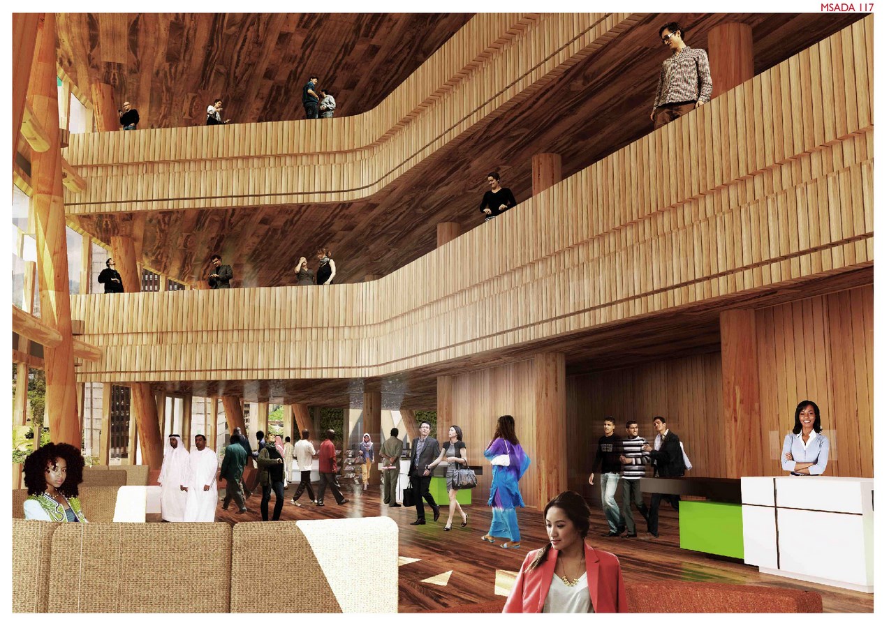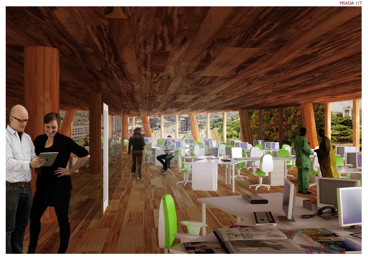 Native Skyscraper is built with experimental wooden structure. It is inspired by elements of traditional (Africa) and biomimicry architecture. It has a dynamic shape and seems like a Baobab. Project emphasises benefits of wood.
