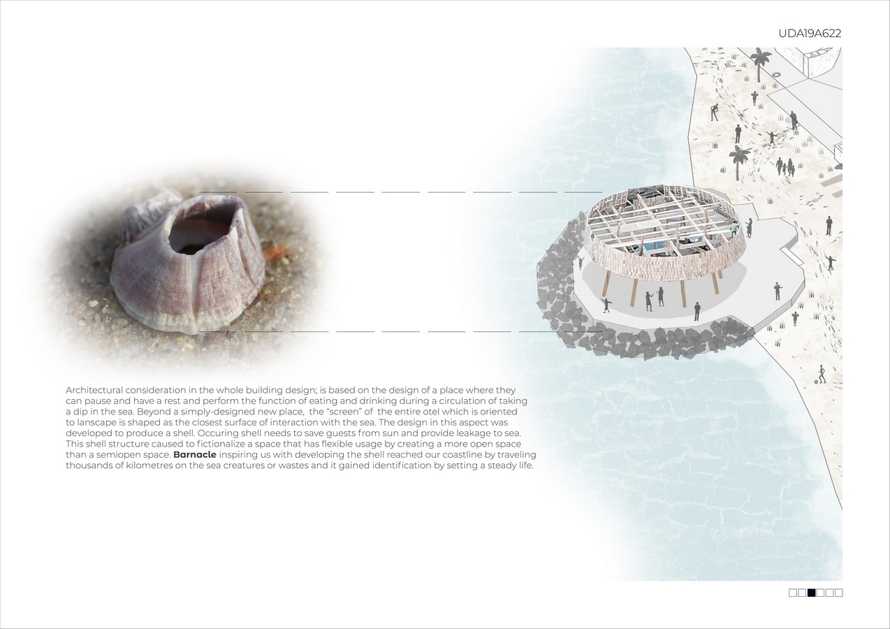 Architectural consideration in the whole building design; is based on the design of a place where they can pause and have a rest and perform the function of eating and drinking during a circulation of taking a dip in the sea. Beyond a simply designed new place, the “screen” of the entire otel which is oriented to lanscape is shaped as the closest surface of interaction with the sea. The design in this aspect was developed to produce a shell. Occuring shell needs to save guests from sun and provide leakage to sea.