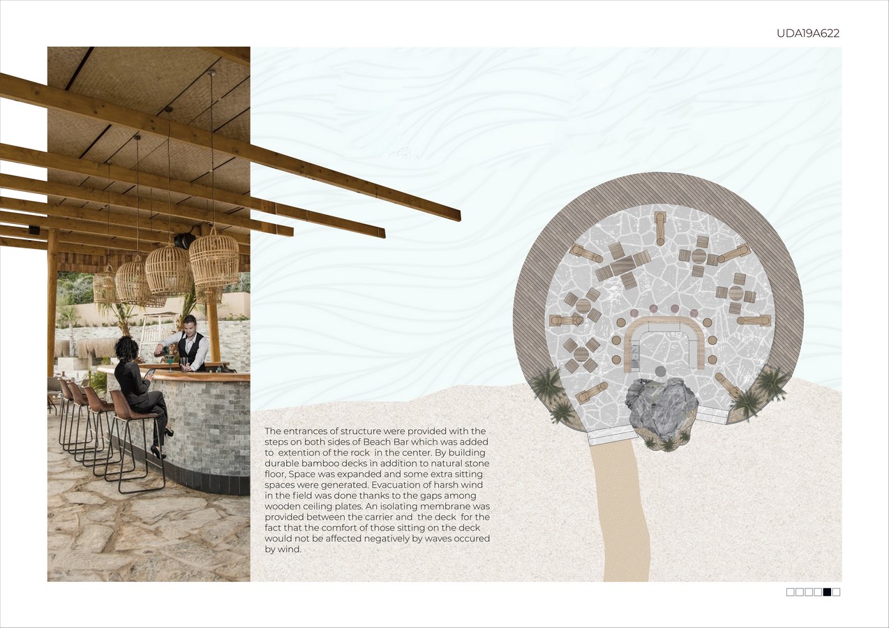 The entrances of structure were provided with the steps on both sides of Beach Bar which was added to extention of the rock in the center. By building durable bamboo decks in addition to natural stone floor, space was expanded and some extra sitting spaces were generated. Evacuation of harsh wind in the field was done thanks to the gaps among wooden ceiling plates. An isolating membrane was provided between the carrier and the deck for the fact that the comfort of those sitting on the deck would not be affected negatively by waves occured by wind.