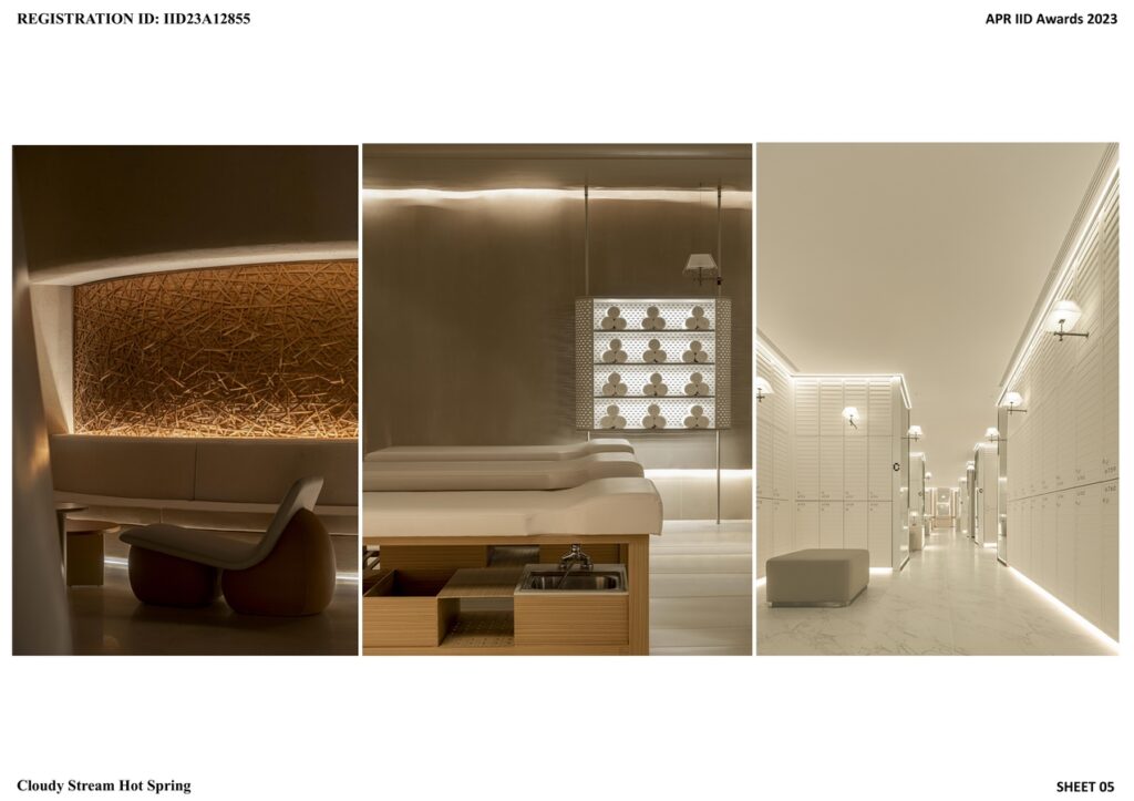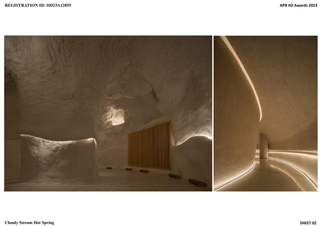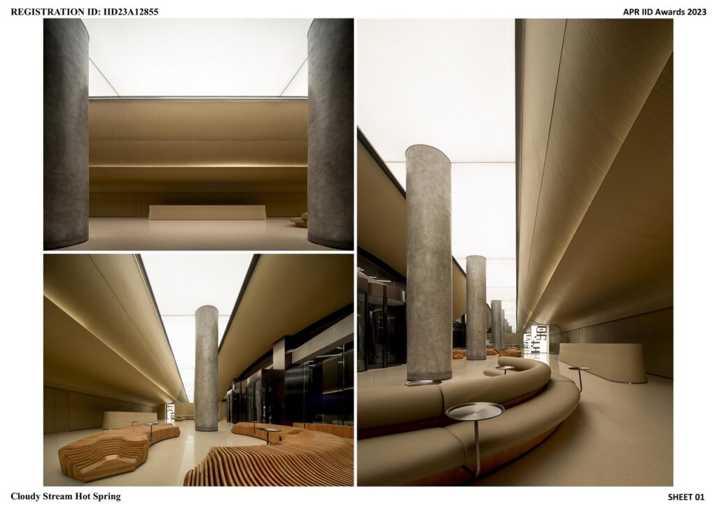 Cloudy Stream Hot Spring is located in Shenyang, China, with an area of 9,700 square meters. A strong sense of being wrapped by a flowing stream is present. The original wooden bench becomes the centerpiece of the lobby, while the curved elements and the block contrast hardness with softness. Besides, the creative arcs, which form the beautiful gyrations of the transitional space and are illuminated by an invisible light source,which piques people’s interest in exploring the room in twists and turns.