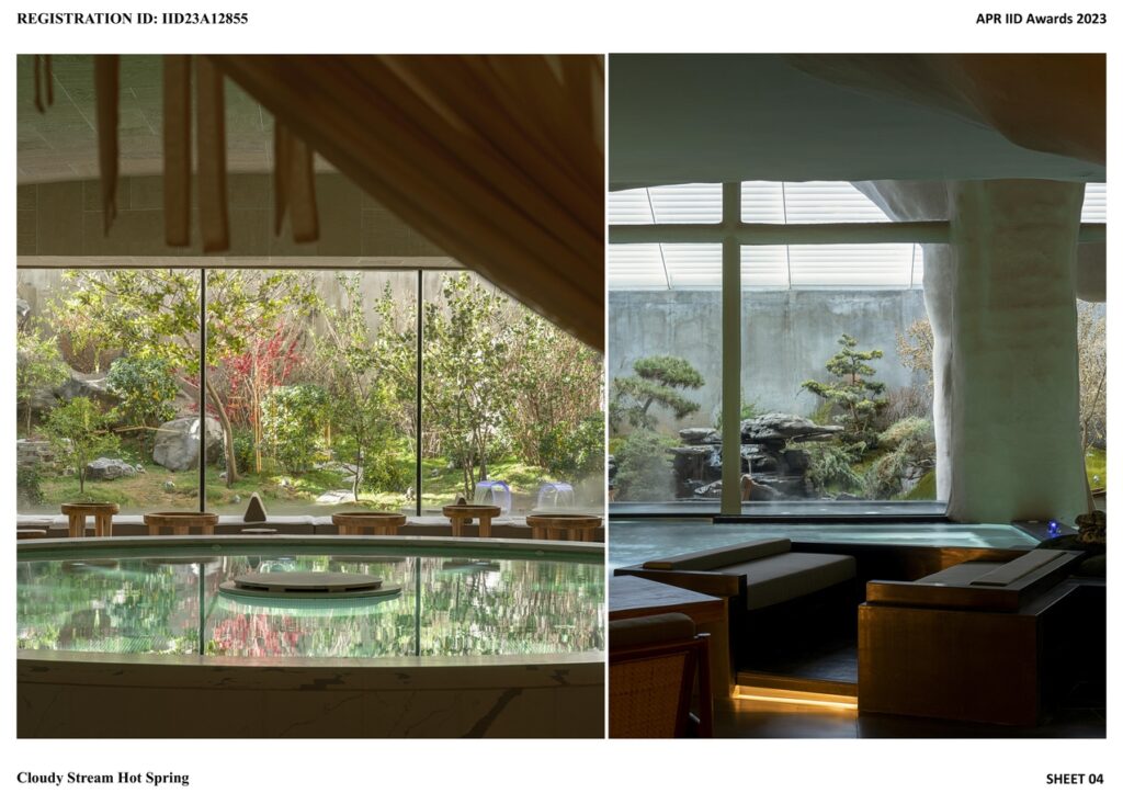 It feels like a primitive cave as you turn into the soup pond section. The marks of time and the traces of flowing water carve the unique inner world of the space. The designers have tapped into the power of nature to bring sunlight and greenery into the space, complementing the oriental garden scenery through irregular holes, water shadows and light spots. In addition, there is a clear flow of pedestrian circulation thanks to the specified axial distances between the various pools.