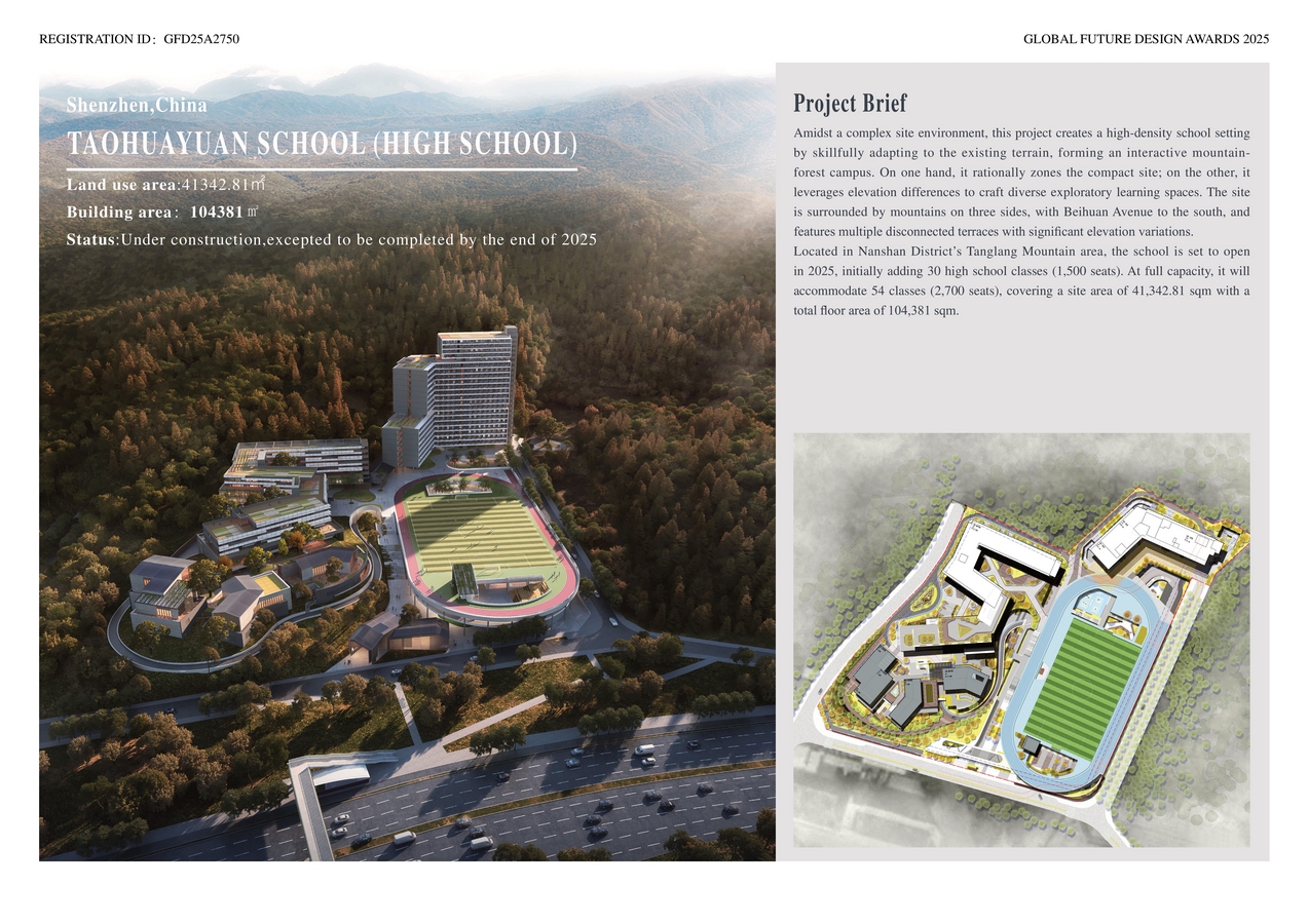 Located in Nanshan District’s Tanglang Mountain area, the school is set to open in 2025, initially adding 30 high school classes (1,500 seats). At full capacity, it will accommodate 54 classes (2,700 seats), covering a site area of 41,342.81 sqm with a total floor area of 104,381 sqm.
