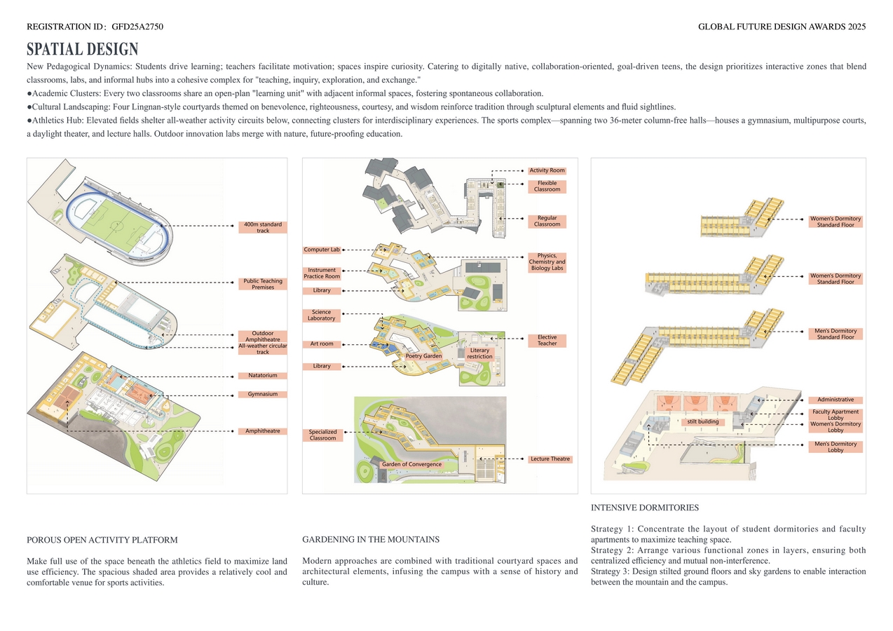 - Athletics Hub: Elevated fields shelter all-weather activity circuits below, connecting clusters for interdisciplinary experiences. The sports complex—spanning two 36-meter column-free halls—houses a gymnasium, multipurpose courts, a daylight theater, and lecture halls. Outdoor innovation labs merge with nature, future-proofing education.