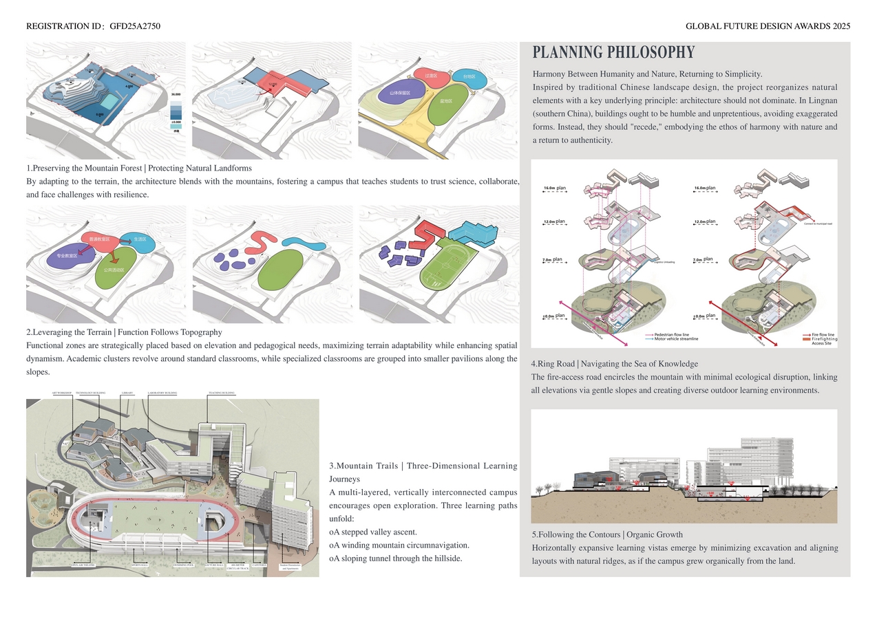Amidst a complex site environment, this project creates a high-density school setting by skillfully adapting to the existing terrain, forming an interactive mountain-forest campus. On one hand, it rationally zones the compact site; on the other, it leverages elevation differences to craft diverse exploratory learning spaces. The site is surrounded by mountains on three sides, with Beihuan Avenue to the south, and features multiple disconnected terraces with significant elevation variations.