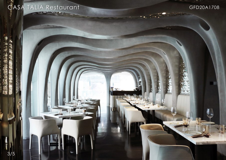 This mysterious spectacle does not only employ simply arcs, but rather utilize elegant complex curvatures to render and connect its ceiling, walls, and ground. The lighting hidden in the structure of its skeleton illuminates the surrounding textures. It unveils the alluring paradox between the concrete and corrugated metallic forms flaunting the contrast between the light and the dark as well as the warm and the cool. Although this symmetrical church-like structure dons only black, white, gray, and gold, it still offers a rich and fulfilling dining experience. From the cozy sofa, people are able to fully admire the majestic rotating staircase of the outer terrace.