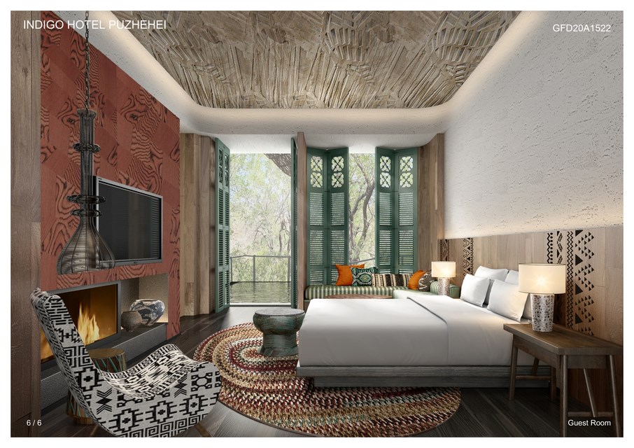 Puzhehei, Yunan Province, once a barren land with only karst limestone rocks, was later known as a miracle realm due to the emergence of lakes and reproduction of life. For thousands of years, Yi people have been tightly bonding with nature and have composed numerous wonderful stories, which become the source of inspiration for YANG design team. In the design of Indigo Hotel Puzhehei, YANG continues the hotel brand’s identity-with touches of fashion and personality, and combines with local features, YANG reinterprets the idea of “neighbourhood culture” , adopting modern arts to tell the neighbourhood story of mutual respect and cherishing between people and nature, and people and animals in this land.
