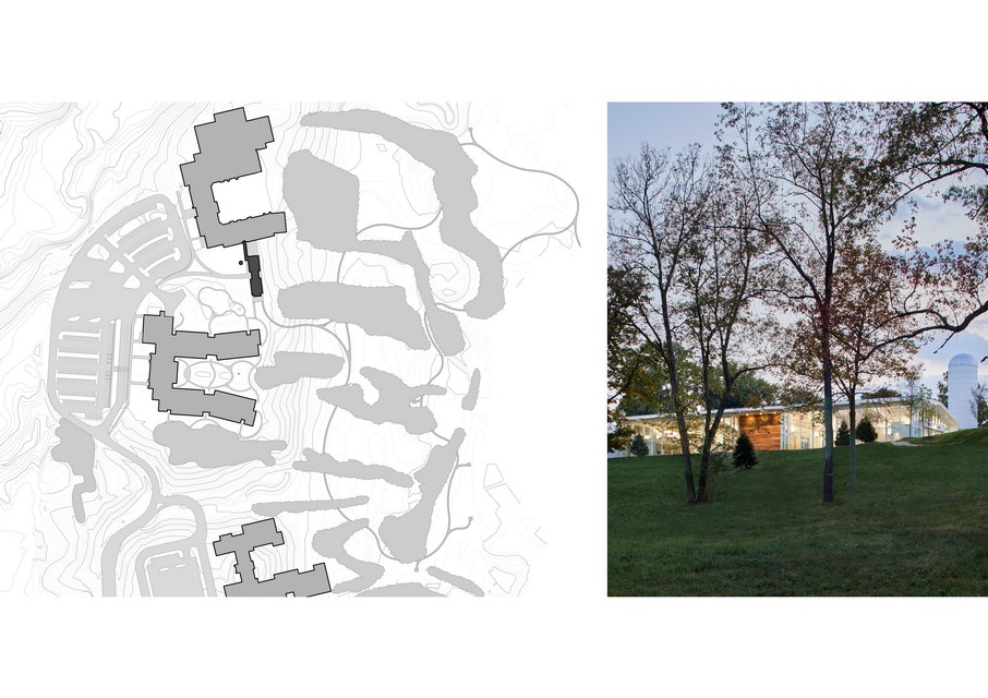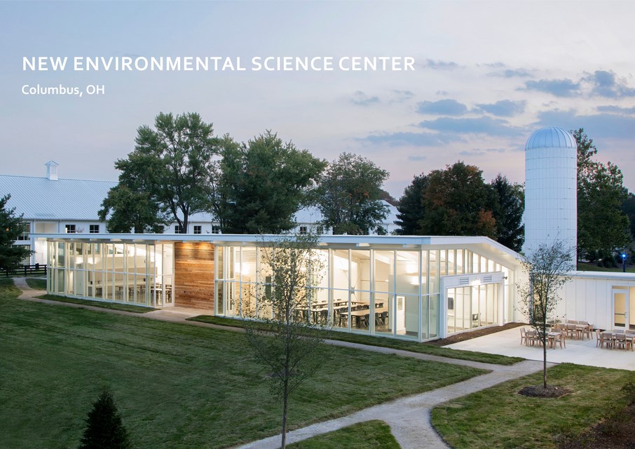 The new Center is a hub for environmental exploration, research, and observation. It provides hundreds of students throughout Central Ohio with the opportunity to explore different habitats, map features with cutting-edge drone technology, and monitor species. The Center includes a laboratory, event space, and meeting rooms with floor to ceiling glass that look out on the campus’ many natural habitats. The site is steeply sloping, nestled between a middle school and a high school, overlooking 100 acres of natural landscape with multiple ecosystems.