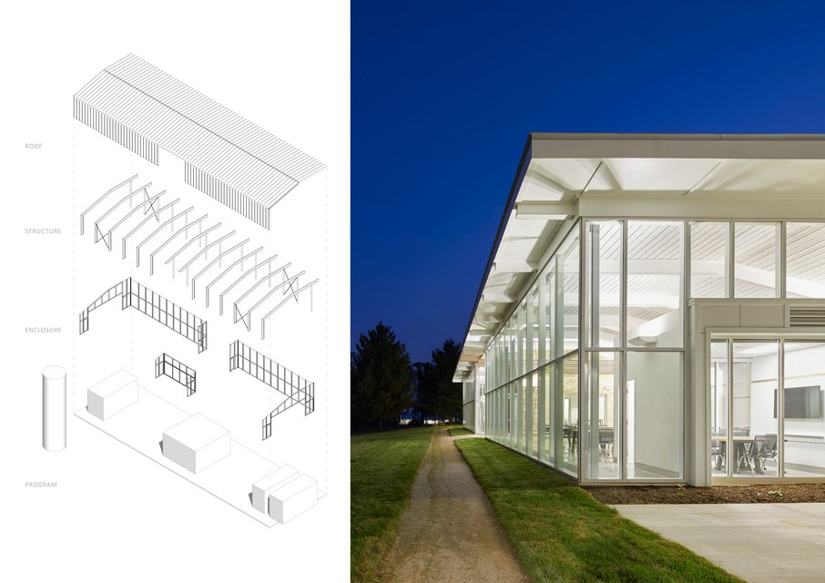 Small meeting spaces, an environmental lab, a monitoring lab, a flexible indoor classroom and an outdoor classroom are arrayed along the hillside and protected by a broad, folded roof supported by a bent steel structure. The entry façade is entirely solid while the façade overlooking the natural landscape is entirely glass, creating a memorable entry experience. Meandering stone dust paths begin at the Center, looping through multiple environments and returning to the Center. Ample storage gives students easy access to materials and equipment to conduct experiments and create projects.