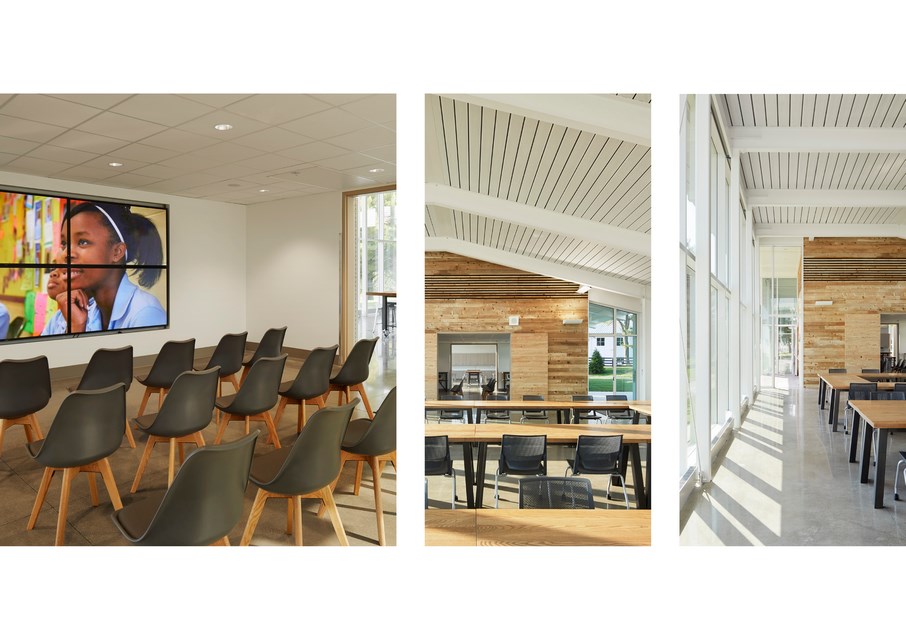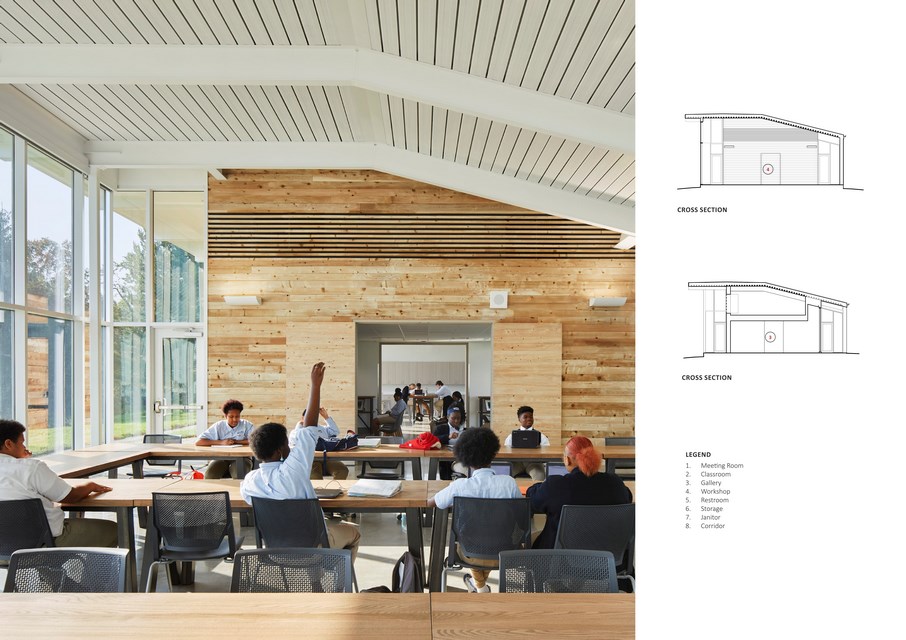 The Environmental Center is one continuous flexible space that is organized as two teaching areas with a presentation room or gallery in the center. Two small meeting rooms anchor one end, and storage and toilet rooms anchor the other. The New Environmental Center is an educational space for students, a gateway to the natural environment, and a visitor center to celebrate student achievements and introduce other groups to the site’s natural resources. The STEM science program will extend to children, families and local school districts in Columbus, in grades K-12, including those who do not attend KIPP, as well as host summer science camps. The school draws on the natural environment surrounding the Center to introduce students from urban neighborhoods to its beauty and their personal responsibility for preserving it while creating a small, but impactful symbol of environmental stewardship and student agency.