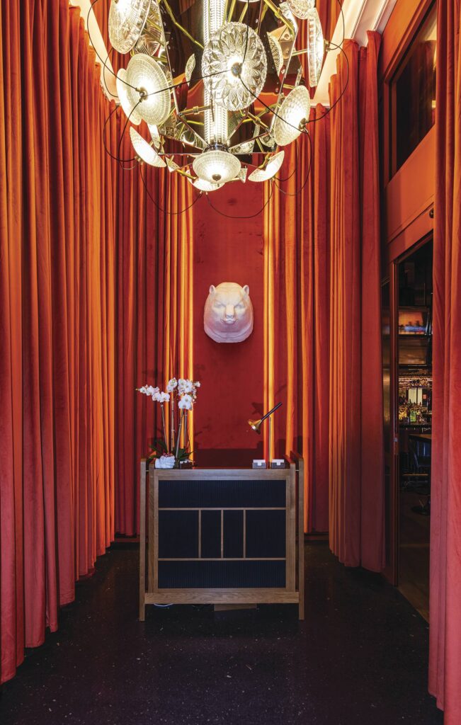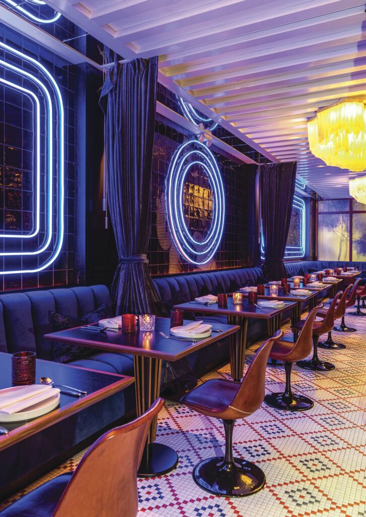 What are some design moments we might not have noticed yet? For this restaurant we have many unique elements, all making small winks that can be found throughout all the space: The image of the bear (the symbol of Madrid) will be found at the entrance, on the paintings wearing a spacesuit, and you can find a little surprise at the menâs bathroom. … There is a brutalist mural in colored stone resin that could look like a piece discovered on one of the expeditions to the moon. … Showcased in the main dining [room], you can find custom-made Cassini satellites, giving us a link to the space and acting as dividing screens without blocking or enclosing the views. … You can find different murals reflecting the flamenco spirit, one of the most known and traditional dances in Spain, on which we added some neon lights for a more avant-garde look. … A kinetic installation of spinning mirrors was [hung] on top of the bar to act as the ânewâ disco ball.