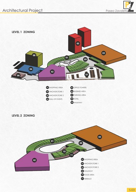 The approach, study and execution of the executive project Plaza Zavaleta has as a priority the dignity of the user respecting routes, dimensions and views through each space of the plaza, resulting in particular environments that underlie the application of high quality materials innovation and cutting edge technology Similarly, in the area of commercial premises a final finish is proposed based on fine flattened surfaces and paints with ecological properties.