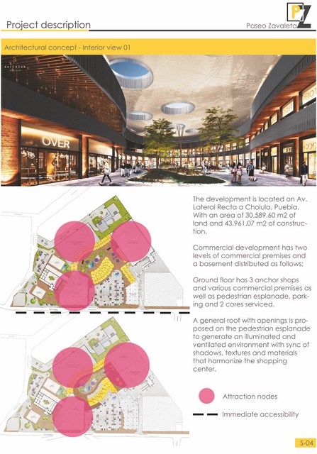 Ground floor has 3 anchor stores and various commercial premises as well as a pedestrian esplanade, parking and 2 service centers It is proposed in the pedestrian esplanade one to usually covered with openings that allow generating an illuminated and airy with synchronicity of shadows,