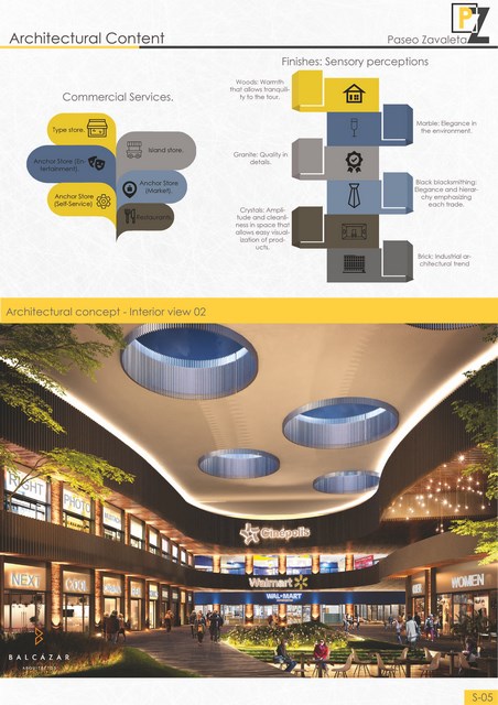 The commercial plaza will be finished in its ceramic material walkways the existing railings in the project will be made of tempered glass The exterior walls of the plaza will have a wood textured exterior plank to create harmony with the previously mentioned finishes on walkers The commercial premises in the interior, both type premises and anchor stores, will have a rustic finish on floors and walls in order for tenants to adapt the interior design of their projects based on the needs that each of them has.