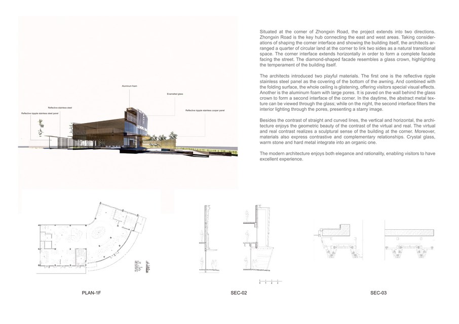The architects introduced two playful materials. The first one is the reflective ripple stainless steel panel as the covering of the bottom of the awning. And combined with the folding surface, the whole ceiling is glistening, offering visitors special visual effects. Another is the aluminum foam with large pores. It is paved on the wall behind the glass crown to form a second interface of the corner. In the daytime, the abstract metal texture can be viewed through the glass; while on the night, the second interface filters the interior lighting through the pores, presenting a starry image.