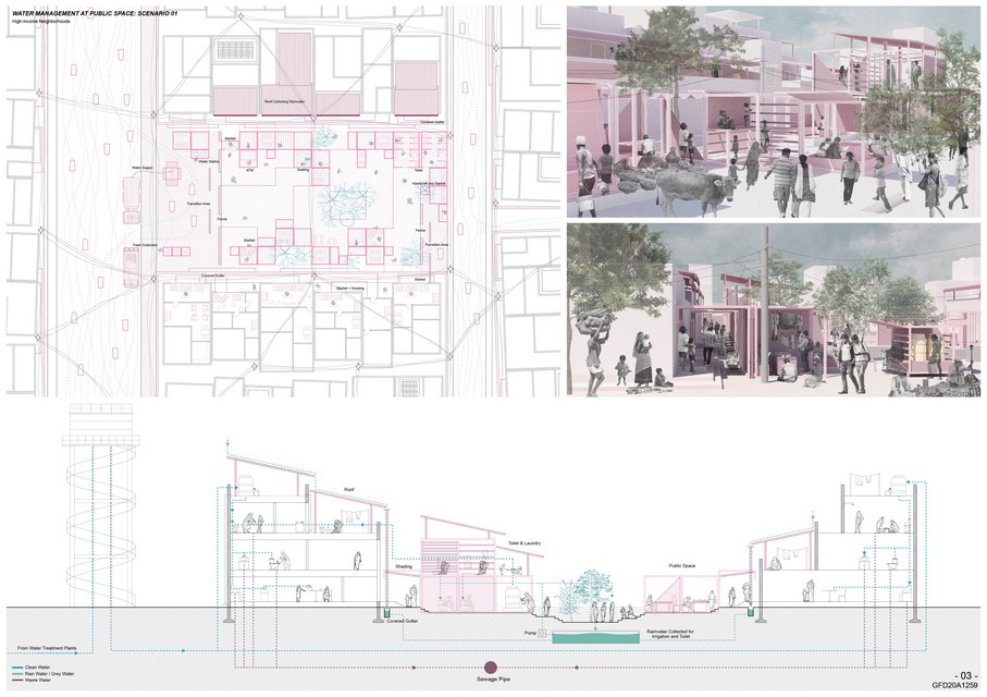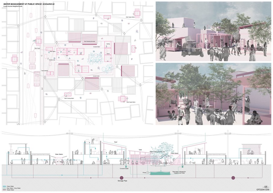 A network system of water supply and discharge within the urban scale is built first to connect households to the water, while collected rainwater is stored and serves only surrounding public toilets. Then, two neighborhoods are selected and developed with specific strategies, focusing on different strategies: basic water infrastructure is of more importance in lower-income neighborhood, whereas public spaces are more needed in higher-income neighborhoods.