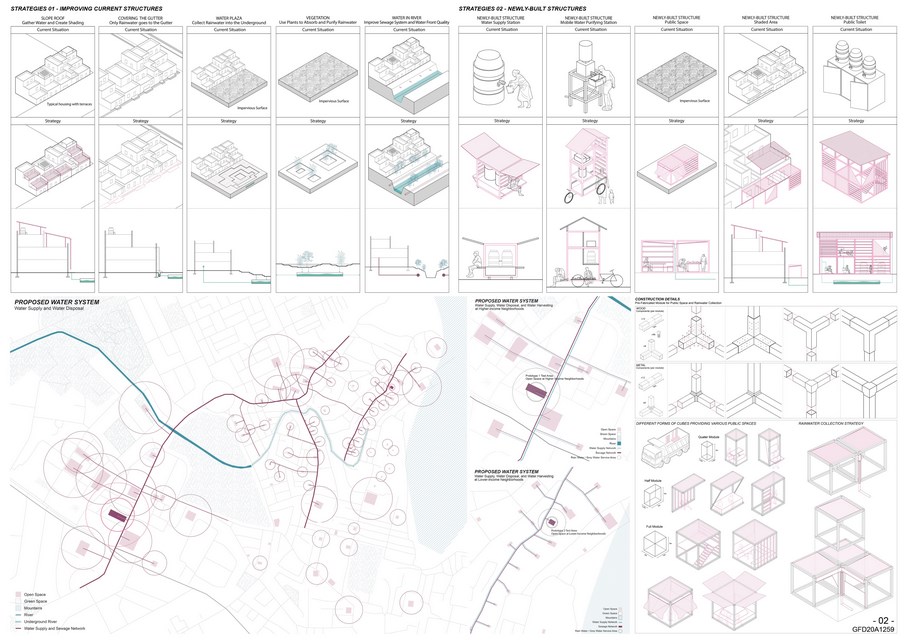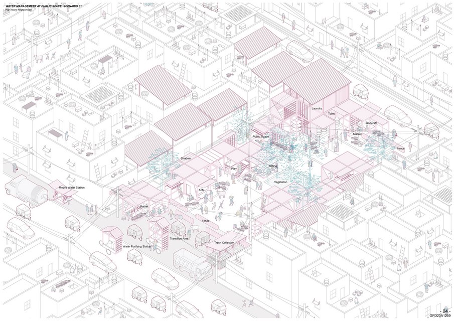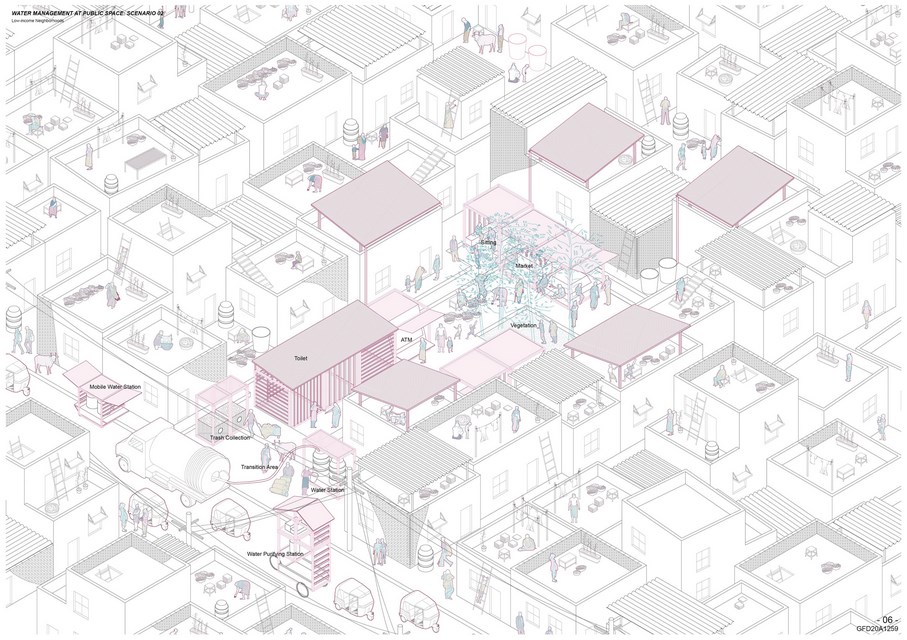 Therefore, the project envisions an alternative way to manage water considering basic water infrastructure related to water lifecycle and harvesting strategies. These water systems are integrated and combined with building structures at public spaces in the community, providing better quality of public spaces while educating the public and giving visibility to the water collection process.