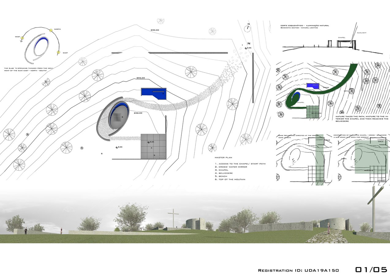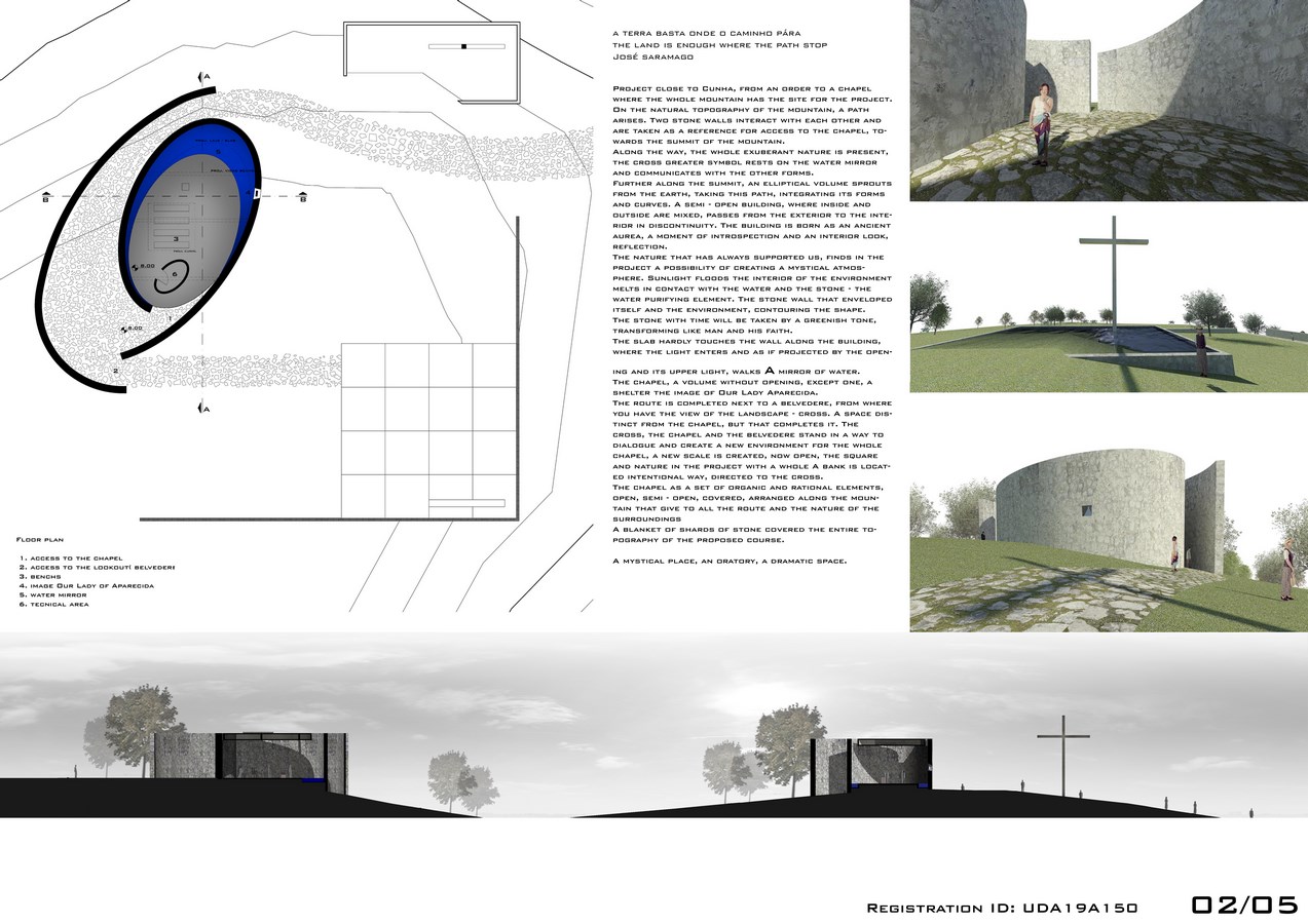 The route is completed next to a belvedere, from where you have the view of the landscape – cross. A space distinct from the chapel, but that completes it. The cross, the chapel and the belvedere stand in a way to dialogue and create a new environment for the whole chapel, a new scale is created, now open, the square and nature in the project with a whole A bank is located intentional way, directed to the cross.