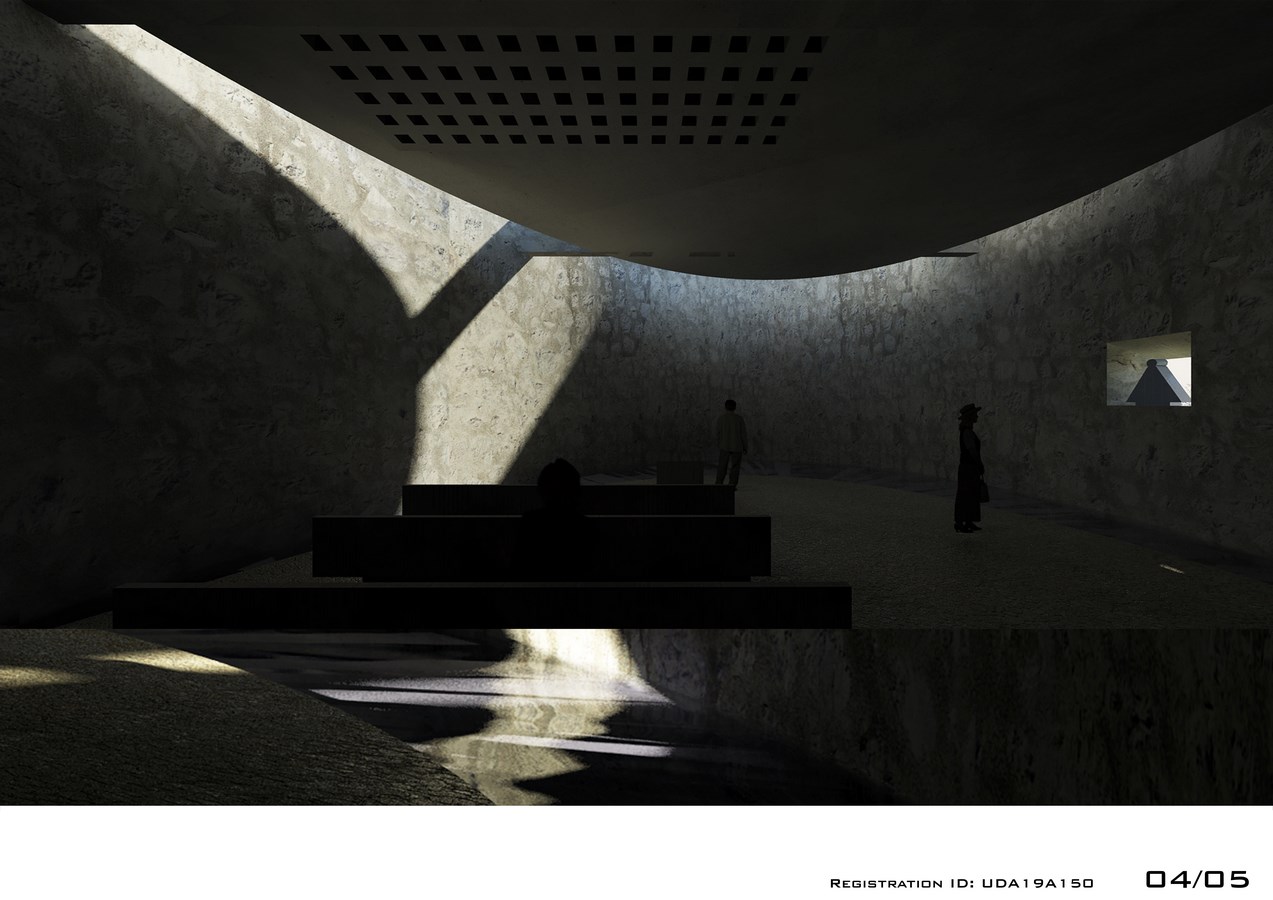 Further along the summit, an elliptical volume sprouts from the earth, taking this path, integrating its forms and curves. A semi – open building, where inside and outside are mixed, passes from the exterior to the interior in discontinuity. The building is born as an ancient aurea, a moment of introspection and an interior look, reflection.