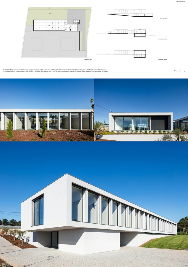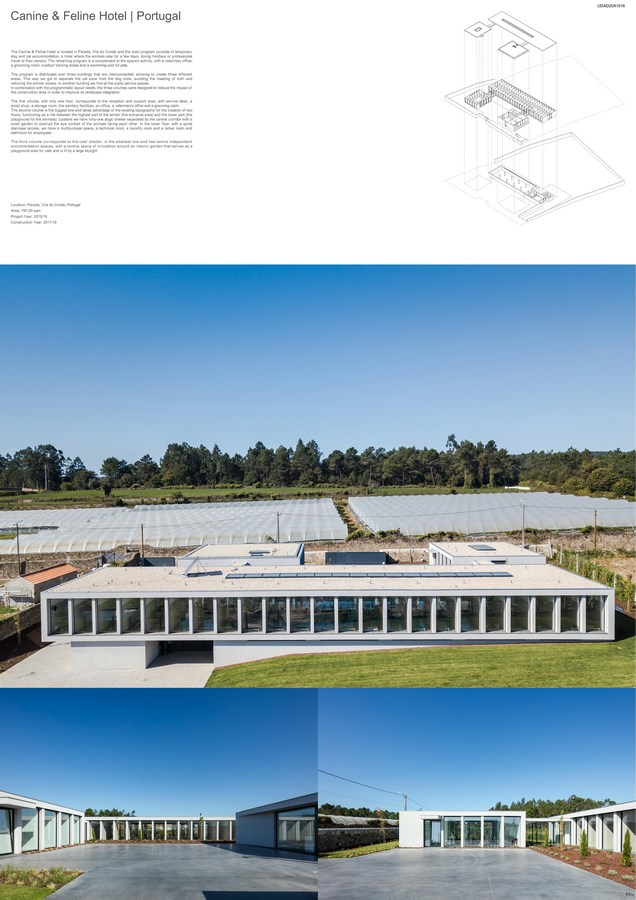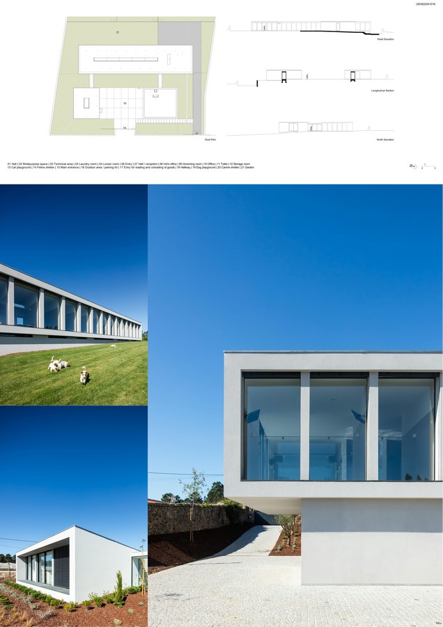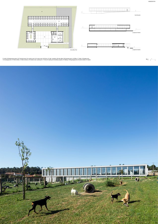 The Canine & Feline Hotel is located in Parada, Vila do Conde and the main program consists of temporary dog and cat accommodation, a hotel where the animals stay for a few days, during holidays or professional travel of their owners. The remaining program is a complement to the space’s activity, with a veterinary office, a grooming room, outdoor training areas and a swimming pool for pets.