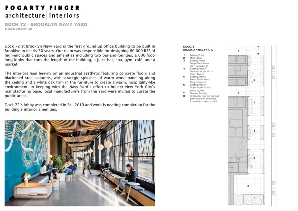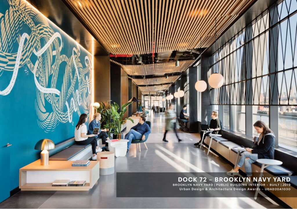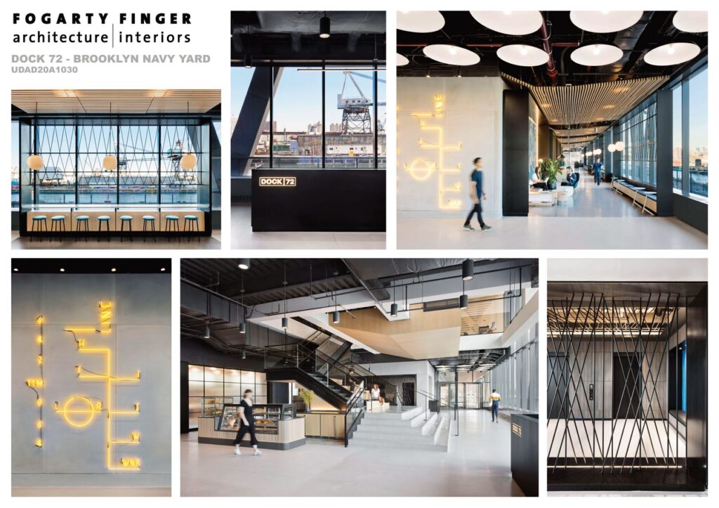 After being engaged to design the interior public and amenity spaces at Dock 72 in the Fall of 2015, our design team completely immersed themselves in the rich and vibrant historic surroundings of the Brooklyn Navy Yard. Our team was deeply inspired by the historic spirit of innovation, connectivity and creative collaboration that has long been a major current in the Navy Yard. The site for Dock 72 has incredible views back towards Manhattan but it was the magic of the Navy Yard that drew our eyes inward towards the Yard itself.