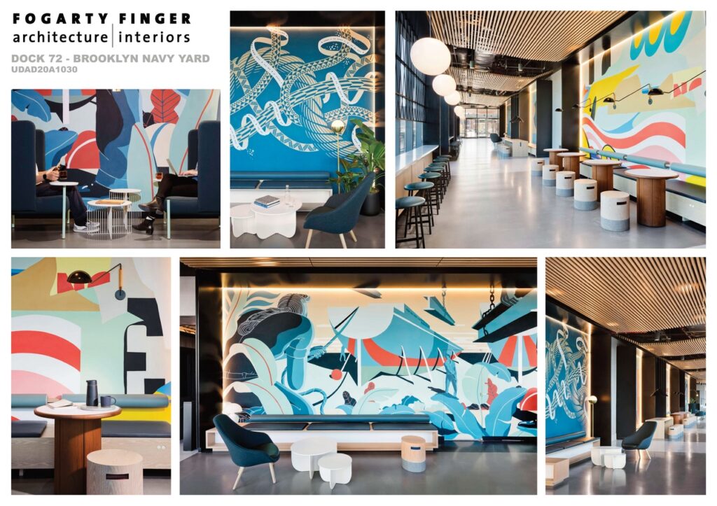 When visitors walk into the lobby of Dock 72, the first thing they see is a neon yellow Plimsoll line symbol on the wall. Then, running along the entire stretch of the lobby are murals created by Brooklyn-based artists Dan Funderburgh, Kristin Texeira, Greg Lamarche, and Bryce Wymer.