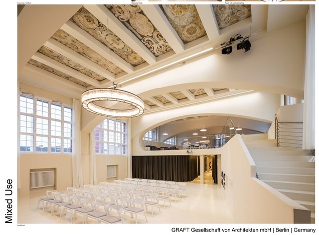 This mezzanine offers visitors an unexpected close look to the coffered ceilings and also allows many different visual connections to its lower main level. The total ceiling height in the lecture hall and also in the entrance area of the Kabbalah centre will be preserved. From the entrance, with its generous staircase winding upwards, the path leads past teaching rooms and office spaces directly in the large lecture hall, which seems to be the goal of the “path”. An oversized mirror on the back wall visually expands the space to twice its length and continues the rhythm of the arches. Here in the lecture hall, a second wide staircase leads to the upper level, where the gallery with a kitchen for large parties and dinner events is located. It offers space for 100 dinner guests. The large historical windows allow a clear view into the two adjacent courtyards and the architecture by Otto Spalding.