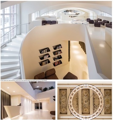 Visitors and guests will enter the Kabbalah Centre through a spacious foyer which offers a view to the historic coffered ceiling. The high room with its round arches has been freed from all the interim built fixtures, giving it back its generous hall effect. The coffered ceiling has been extensively excavated in order to experience the vast space in its full extent. Even though the centre is provided with the needed small rooms and intimate spaces, the idea of the architectural intervention is to gain a great impression of the entire space and experience it from different angles. For this purpose a second level, which seems to float freely inside the hall, will